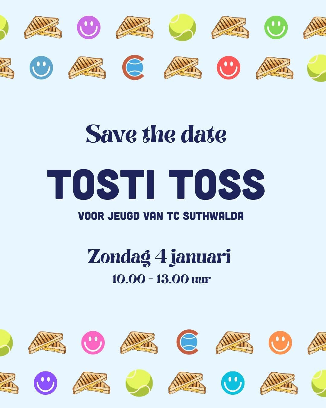 Op *zondag 4 januari* organiseren we een gezellige *Tennis-Tosti-Toss*!